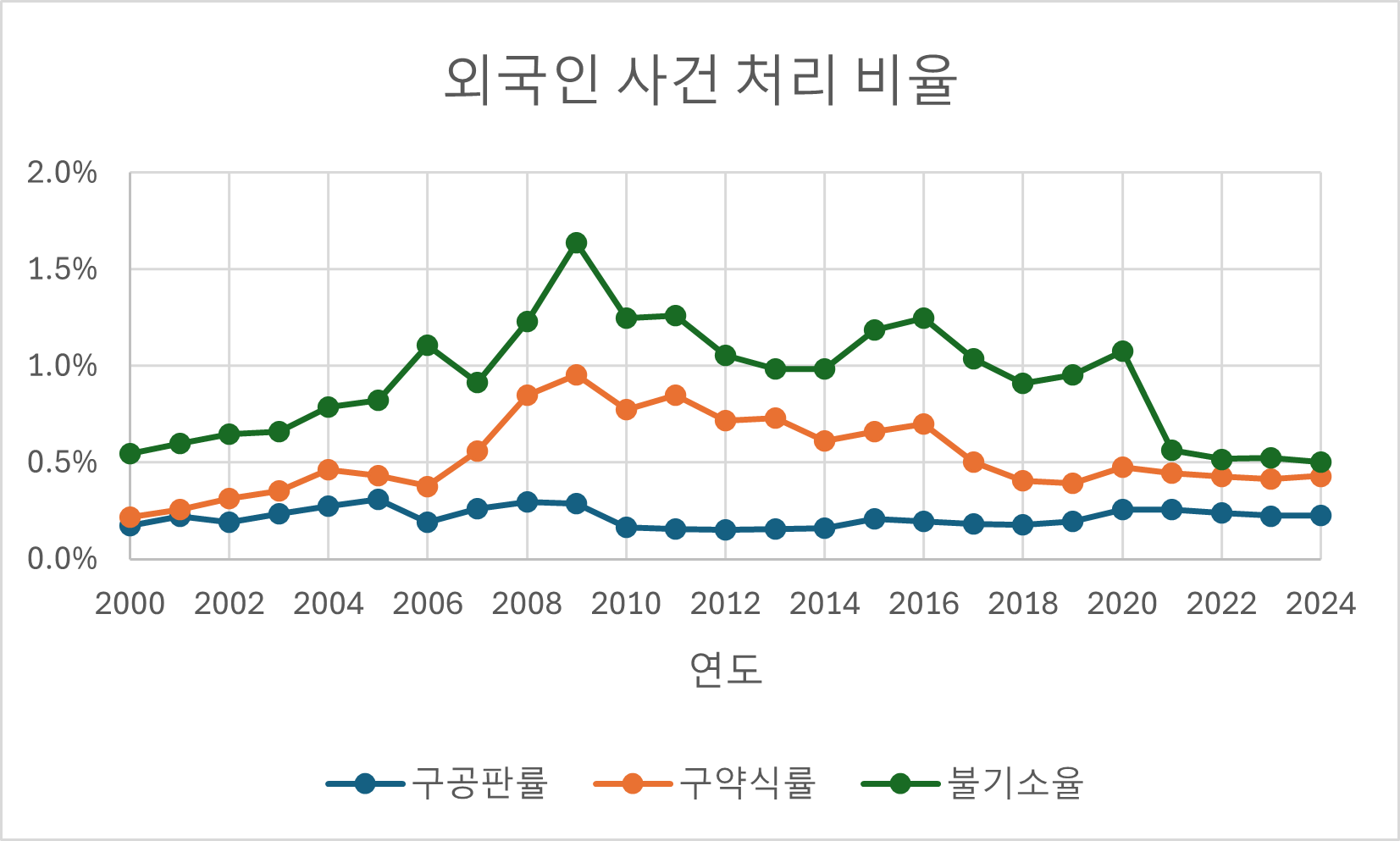 그리고 본문에서는 정성적으로만 설명했는데, 외국인 범죄율과 구약식률의 상관계수는 0.93, 불기소율의 상관계수는 0.92, 구공판율의 상관계수는 0.096입니다.