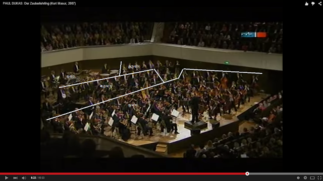 현악기들은 관객석 쪽이 수석자리이기에, 위의 그림에서는 2바와 비올라 수석의 위치가 반대인 것 같아요.