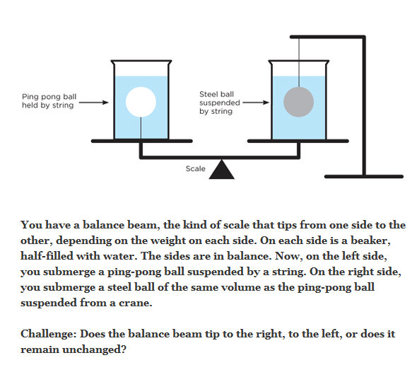 탁구공의 밀도는 물의 밀도보다 작기 때문에 '탁구공의 질량<그 부피만큼의 물의 질량' 이므로 저울이 오른쪽으로 기운다고 보는데