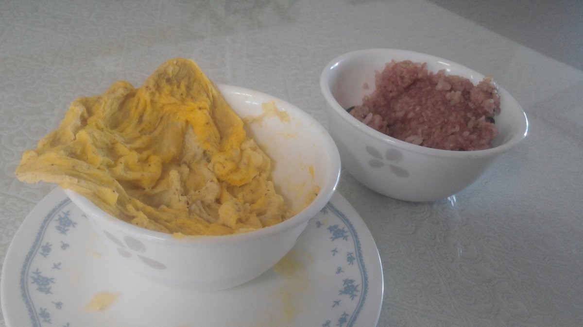 계란찜은 물만 조금 섞은 채 렌지에 돌린 다음 위에 딱딱한 부분만 올려놓은 것 같습니다.