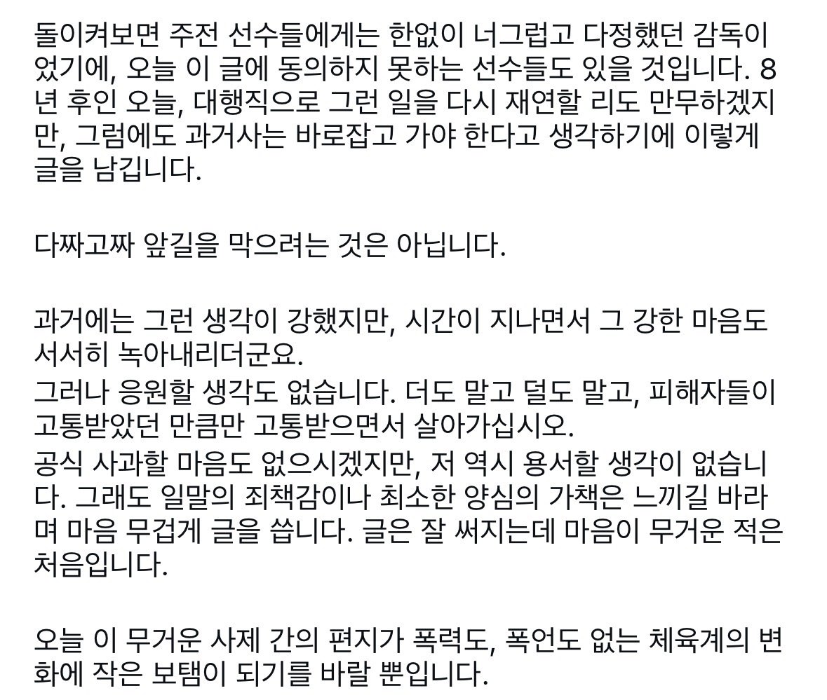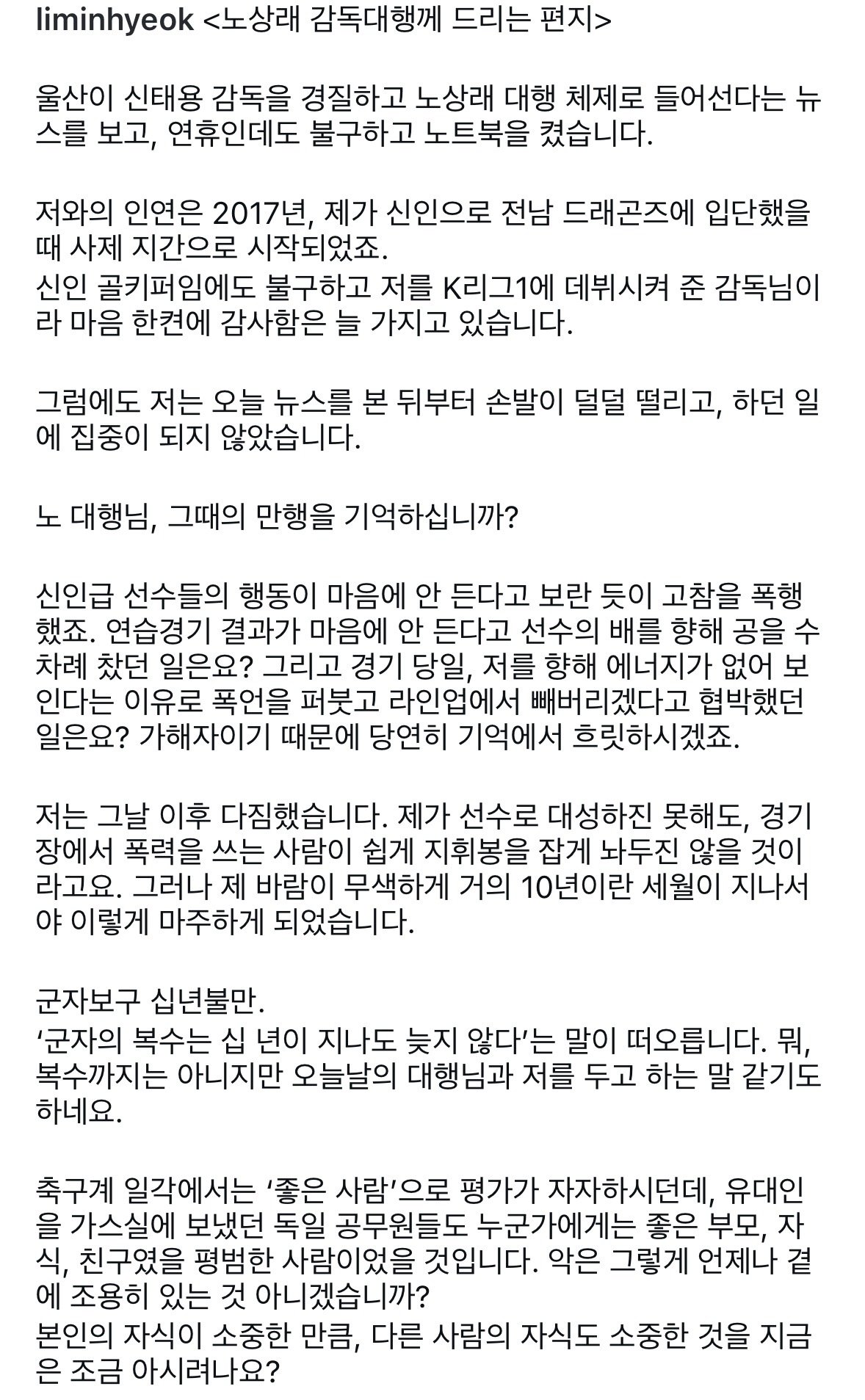 폭로 내용 중 고참 선수 폭행(손찌검)과 연습 경기 후 선수들에게 공 찬 내용은 인정 손찌검 했던 고참 선수하고는 그 직후 사과하고 화해했음. 썰아재가 직접 그 선수와 통화도 했는데 사실이고 지금은 사이 괜찮아서 어제 노대행에게 직접 전화해서 응원도 했다고 함 추가로 2명의 당시 전남 선수하고도 통화했는데 그 사건이 충격적이었지만 잘 풀었다, 어린 선수들에게 말을 쎄게 했고 그게 폭언으로 들릴 순 있지만 시즌 내내 그런 분위기 아니었고 대체적으로 선수들과 관계 좋았다고 얘기했다고 함 노대행은 임민혁 전 선수 건은 명확하게 기억나지 않지만 사과하겠다는 의사 밝혔다고 함 출처: 썰호정 퍼왔습니다.