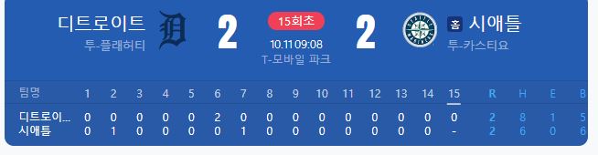 시애틀 대 디트로이트 2:2 상황이고, 지금 15회초로 넘어갔습니다.