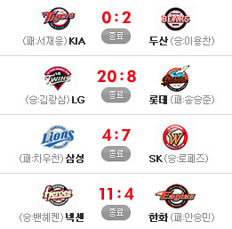 [삼성 4 (종료) 7 S K] [넥센 11 (종료) 4 한화] [L G 20 (종료) 8 롯데] 이렇게 오늘의 경기가 다 끝이 납니다.. 응원 & 중계 하시느라 수고하셨습니다.. 편안한 밤 되시고 내일 뵙겠습니다..