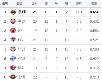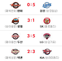 [두산 3 (종료) 5 L G] [롯데 3 (종료) 1 S K] [한화 0 (종료) 5 삼성] [넥센 2 (종료) 3 KIA] 이렇게 오늘의 경기가 다 끝이 납니다.. 응원 & 중계 하시느라 수고하셨습니다.. 내일도 2시 경기이니 착오 없으시길 바랍니다..