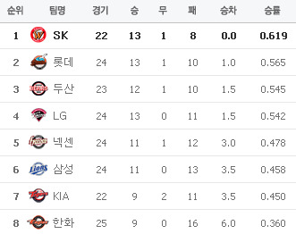 순위     팀명    경기    승     무     패     승률     게임차    연속