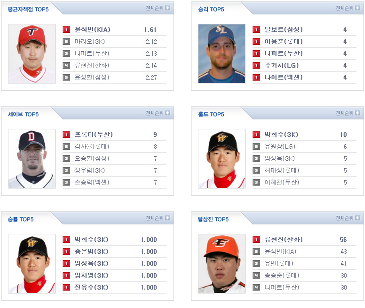 [잠실] 윤성환(삼성, 1승 2패 2.27) vs 리즈(LG, 0승 2패 13.50) [문학] 강윤구(넥센, 0승 2패 5.74) vs 이영욱(SK, 0승 1패 5.82) [대전] 송승준(롯데, 2승 3패 4.58) vs 류현진(한화, 1승 2패 2.14) [무등] 니퍼트(두산, 4승 2패 2.13) vs 심동섭(KIA, 0승 0패 5.40)