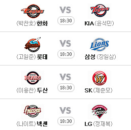 [넥센 1 (2회초) 0 L G] [두산 1 (1회말) 1 S K] [롯데 0 (3회초) 0 삼성] [한화 0 (3회초) 0 KIA]