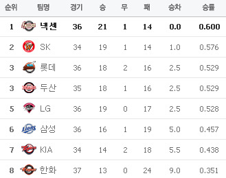 이대로 끝나면 LG 두산 롯데가 승차가 없어지고 LG가 승률에서 뒤진 5위로 가겠군요. 1위부터 7위까지 5.5게임. 한화만 안드로로.......