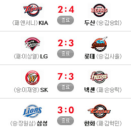 [S K 7 (종료) 3 넥센] [삼성 3 (종료) 0 한화] [L G 2 (종료) 3 롯데] 이렇게 오늘의 경기가 다 끝이 납니다.. 응원 & 중계 하시느라 수고하셨습니다.. 섹시한 밤 되세요..