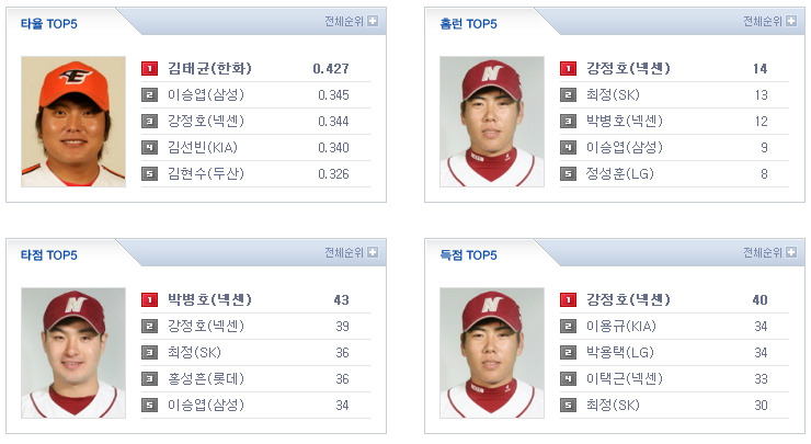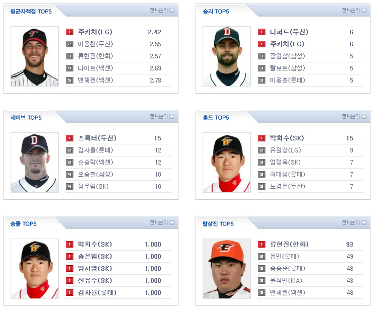 [잠실] 양훈(한화, 3승 2패 3.99) vs 이승우(LG, 0승 5패 4.08) [문학] 서재응(KIA, 3승 2패 3.33) vs 김광현(SK, 시즌 첫 등판) [대구] 김선우(두산, 2승 1패 6.17) vs 탈보트(삼성, 5승 1패 3.40) [사직] 김영민(넥센, 3승 1패 1.91) vs 유먼(롯데, 3승 2패 3.21) 김광현 복귀.. 그리고 엘지의 5할 단두대 매치 시즌 10차전 -_-
