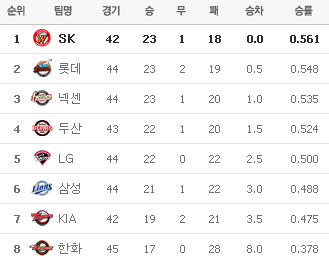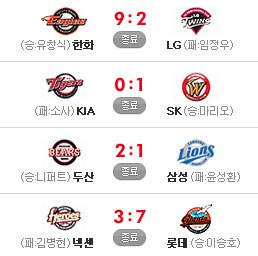 [한화 9 (종료) 2 L G] [KIA 0 (종료) 1 S K] [두산 2 (종료) 1 삼성] [넥센 3 (종료) 7 롯데] 이렇게 오늘의 경기가 다 끝이 납니다.. 응원 & 중계 하시느라 수고하셨습니다.. 내일 쉬시는 분들은 불타는 밤을, 내일 일하시는 분들은 따뜻한 밤 보내시기를..