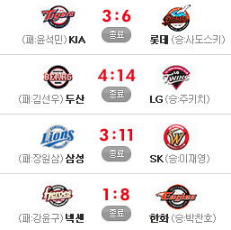 [삼성 3 (종료) 11 S K] [넥센 1 (종료) 8 한화] [KIA 3 (종료) 6 롯데] 응원 & 중계 하시느라 수고하셨습니다.. 섹시한 밤 되시길..