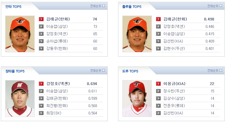4. 김태균 (1 루)      4. 짐승엽 (1 루)