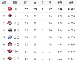 4       롯 데     53     27     2     24    0.529      2.0     (1패)