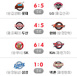 [롯데 6 (종료) 5 L G] [삼성 1 (종료) 0 넥센] [두산 4 (종료) 5 한화] [S K 6 (종료) 4 KIA] 이렇게 오늘의 경기가 다 끝이 납니다.. 응원 & 중계 하시느라 수고하셨습니다.. 그나 내일 쉬시는 분들 부럽네요.. 유유.. 섹시한 밤 되시고 내일 뵙겠습니다..