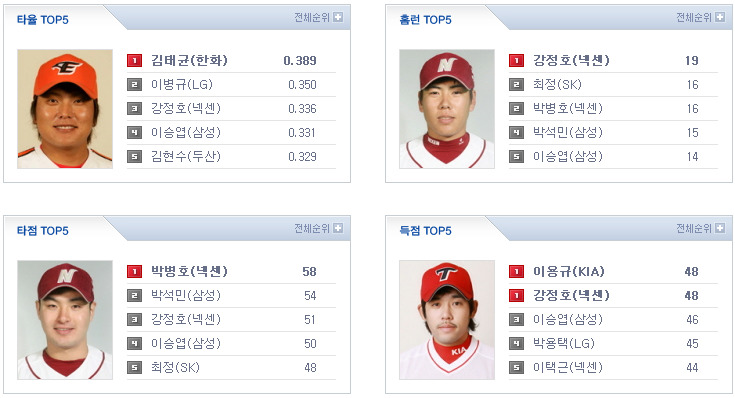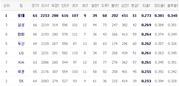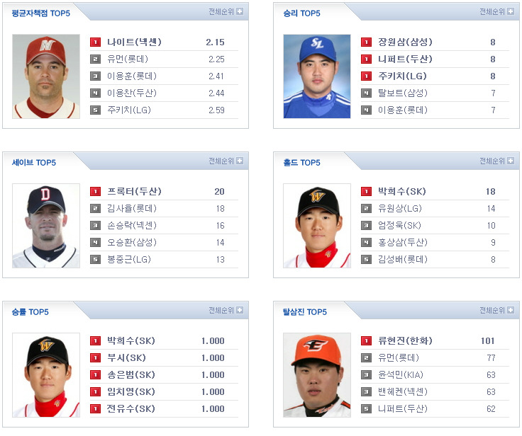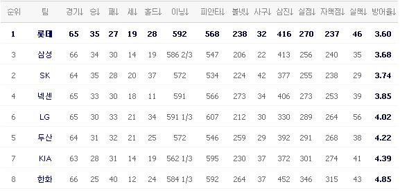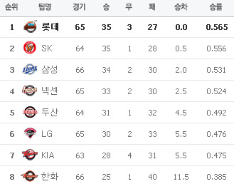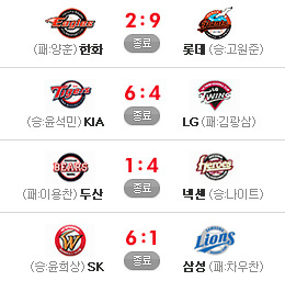 [KIA 6 (종료) 4 L G] [두산 1 (종료) 4 넥센] [S K 6 (종료) 1 삼성] [한화 2 (종료) 9 롯데] 이렇게 오늘의 경기가 다 끝이 납니다.. 응원 & 중계 하시느라 수고 많으셨습니다.. 편안한 밤 되세요..