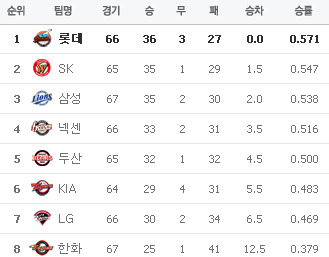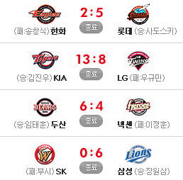 [두산 6 (종료) 4 넥센] [S K 0 (종료) 6 삼성] [한화 2 (종료) 5 롯데] 이렇게 오늘의 경기가 다 끝이 납니다.. 응원 & 중계 하시느라 수고 많으셨습니다.. 편안한 밤 되세요..