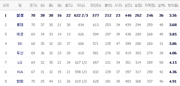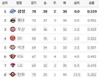1       삼 성     70     38     2     30    0.559        -      (4승)