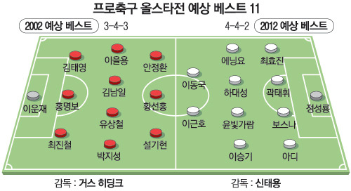 오늘 2012 올스타 중 김은중, 이동국 두 선수는 02년 월드컵 출전 못한 게 한으로 남은 선수들입니다.