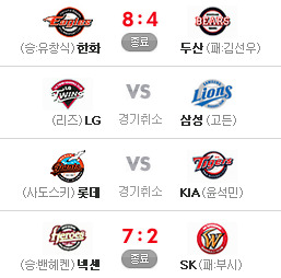 [한화 8 (종료) 4 두산] [넥센 7 (종료) 2 S K] 이렇게 오늘의 경기가 다 끝이 납니다.. 응원 & 중계 하시느라 수고 많으셨습니다.. 내일 뵙겠습니다..