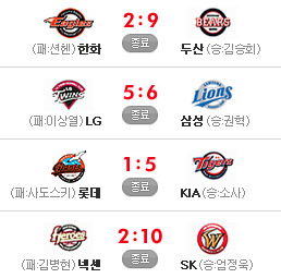 [한화 2 (6회말) 5 두산] [넥센 2 (7회초) 8 S K] [L G 3 (7회말) 3 삼성] [롯데 1 (7회말) 5 KIA]