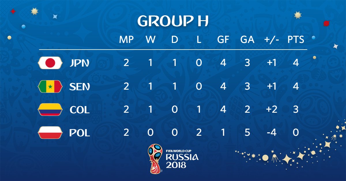 콜롬비아 2-0-1 5득점 2실점 일본 1-1-1 4득점 4실점 경고 3장 세네갈 1-1-1 4득점 4실점 경고 5장 폴란드 1-0-2 2득점 5실점