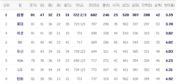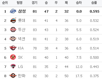 1       삼 성     81     47     2     32    0.595        -      (2승)