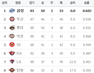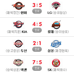[넥센 7 (종료) 5 S K] [KIA 4 (종료) 5 롯데] [두산 2 (종료) 1 삼성] 이렇게 오늘의 경기가 다 끝이 납니다.. 응원 & 중계 하시느라 수고 많으셨습니다.. 저는 남은 옻닭 안주에 술을 주구장창 쳐묵쳐묵 해야겠습니다..