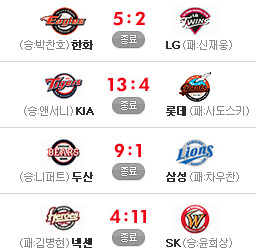 [넥센 4 (종료) 11 S K] [KIA 13 (종료) 4 롯데] [두산 9 (종료) 1 삼성] 오늘 경기 모두 종료 되었습니다. 응원&중계 수고많으셨습니다.~