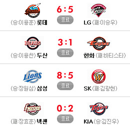 [롯데 6 (종료) 5 L G] [삼성 8 (종료) 5 S K] [두산 3 (종료) 1 한화] [넥센 0 (종료) 2 KIA] 이렇게 오늘의 경기가 다 끝이 납니다.. 응원 & 중계 하시느라 수고 많으셨습니다..