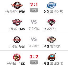 [한화 2 (종료) 1 삼성] [S K 3 (종료) 2 롯데] 이렇게 오늘의 경기가 끝이 납니다.. 수고하셨습니다.. 이제 축구로 고고..