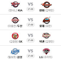 [S K 2 (2회초) 0 넥 센] [두산 0 (3회초) 0 롯데] [KIA 2 (2회초) 0 한화]