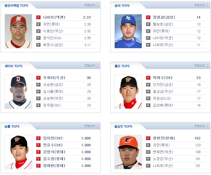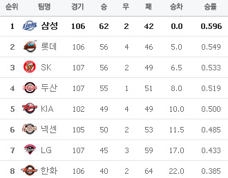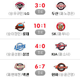 [L G 3 (종료) 0 두산] [롯데 10 (종료) 1 S K] [넥센 6 (종료) 7 한화] [삼성 4 (종료) 0 KIA] 이렇게 오늘의 경기가 다 끝이 납니다.. 응원 & 중계 하시느라 수고 많으셨습니다.. 편안한 밤 되세요..