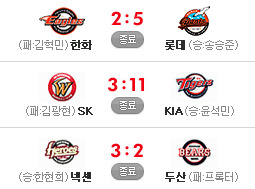[넥센 3 (종료) 2 두산] [한화 2 (종료) 5 롯데] [S K 3 (종료) 11 KIA] 이렇게 오늘의 경기가 다 끝이 납니다.. 응원 & 중계 하시느라 수고 많으셨습니다.. 불금입니다.. 섹시한 밤 되시길 바랍니다..