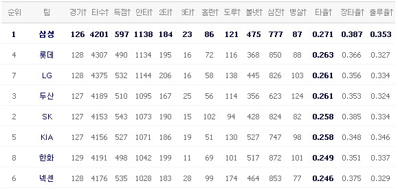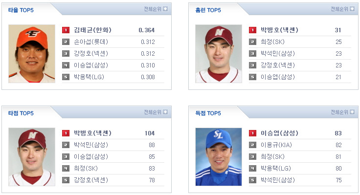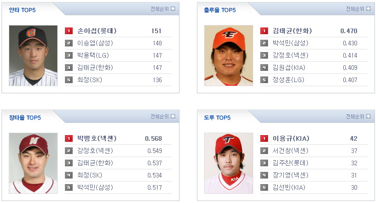 1,2,3-4위 포스트시즌 대진은 어제 경기들로 사실상 확정되었다고 보고 오늘 3경기중엔 기아 서재응 선수의 선발등판 연속이닝 무실점기록 도전이 가장 관심사일것 같은데 이제 틀었더니 1회초는 무실점으로 막았나보네요.