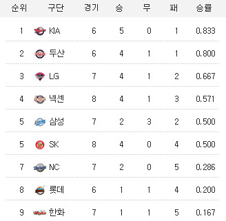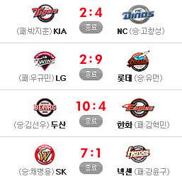 [두산 6 (5회초) 0 한화] [L G 2 (5회말) 4 롯데] [KIA 2 (5회말) 2 N C]