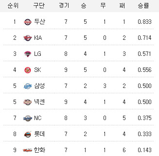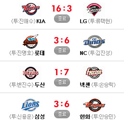 [삼성 3 (9회초) 6 한화] [KIA 15 (8회초) 2 L G] [롯데 3 (9회초) 6 N C]