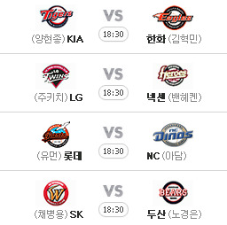 [잠실]SK 여건욱 VS 김선우 두산 [목동]LG 임찬규 VS 강윤구 넥센 [대전]KIA 임준섭 VS 유창식 한화 [마산]롯데 고원준 VS 찰리 NC