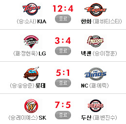 [KIA 12 vs 4 한화] [LG 3 vs 4 넥센] [롯데 5 vs 1 NC] [SK 7 vs 5 두산] 내일 선발투수 예고 [두산(니퍼트) vs (리즈)LG] [넥센(나이트) vs (이브랜드)한화] [NC(노성호) vs (장원삼)삼성] [KIA(김진우) vs (옥스프링)롯데] 중계&응원 수고 많으셨습니다~