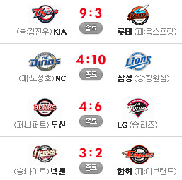 [두산 4 vs 6 LG] [넥센 3 vs 2 한화] [NC 4 vs 10 삼성] [기아 9 vs 3 롯데] 내일 선발투수 예고 [두산(올슨) vs (우규민)LG] [넥센(김병현) vs (윤근영)한화] [NC(이재학) vs (배영수)삼성] [KIA(서재응) vs (이재곤)롯데] 중계&응원 수고 많으셨습니다~