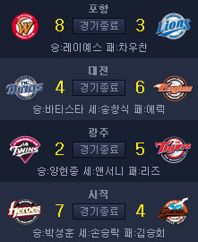 [N C 4 (종료) 6 한화] [L G 2 (종료) 5 KIA] [S K 8 (종료) 3 삼성] [넥센 7 (9회말) 4 롯데]