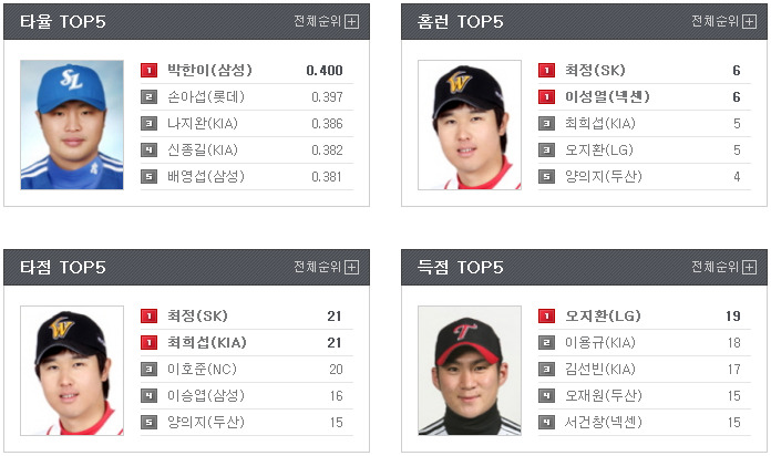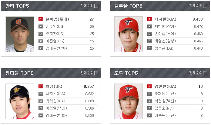 5. 전준우 (중견)      5. 정성훈 (3 루)