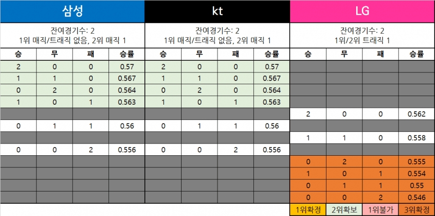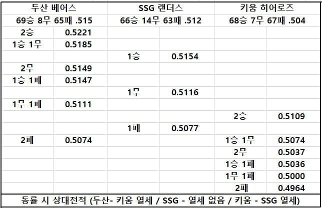 4위도 아직입니다. 오늘 두산이 이겨서 4위를 지켜도, 내일 두산이 한화에게 지고 SSG가 KT를 이긴다면 4위 SSG, 5위 두산이 됩니다