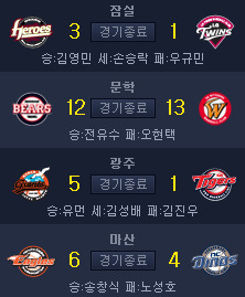 [두산 11 (3회초) 1 S K] [롯데 2 (4회초) 0 KIA] [한화 0 (5회초) 2 N C]