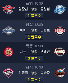 [기아(소사) vs (윤성환)삼성] [NC(이재학) vs (노경은)두산] [SK(윤희상) vs (김병현)넥센] [LG(리즈) vs (김수완)롯데]
