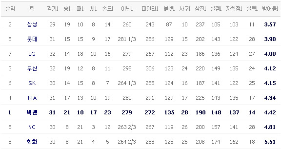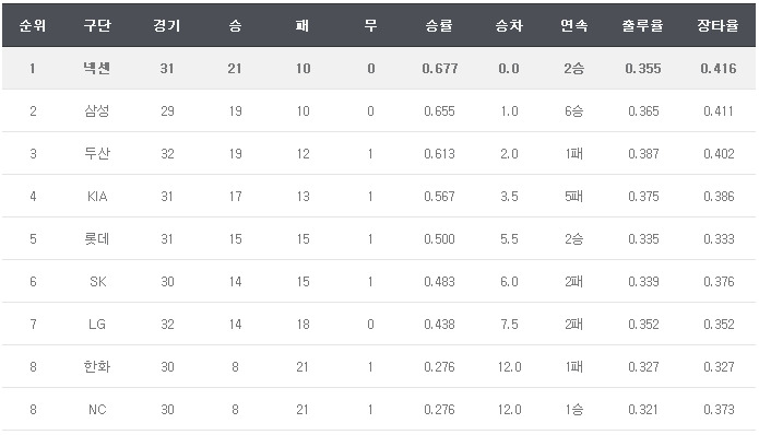 [N C 17 (종료) 5 두산] [S K 5 (종료) 8 넥센] [KIA 4 (종료) 5 삼성] [L G 3 (종료) 8 롯데] 이렇게 오늘의 경기가 다 끝이 납니다. 남은 주말 편안히 보내시고, 다음주 화요일에 뵙겠습니다.. ^^
