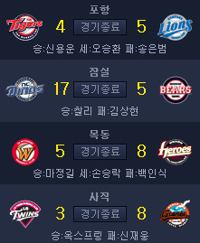 [S K 5 (7회말) 8 넥센] [KIA 4 (9회초) 5 삼성] [L G 3 (8회말) 7 롯데]