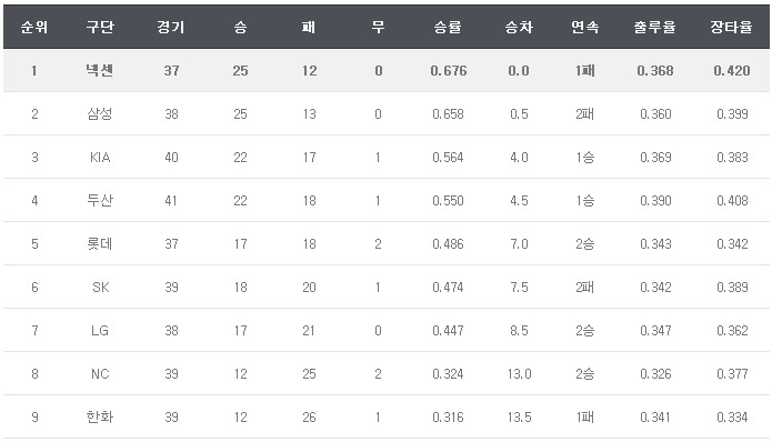 25승 0무 13패 (1위)  :  12승 1무 26패 (9위)