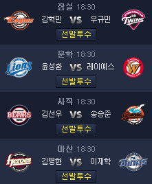 오늘은 선발투수들의 대결이 상당히 눈에 띄네요. 김선우와 송승준은 스토리가 있고, 김병현과 이재학의 대결도 기대됩니다. 새든이 아니라서 아쉽긴 하지만 윤성환과 레이에스의 대결도 좋은 투수전이 될 것 같아요. 한화와 lg야 뭐...
