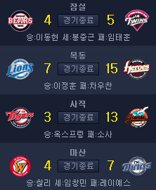[삼성 2 (3회말) 3 넥센] [KIA 1 (3회말) 1 롯데] [S K 0 (3회말) 3 N C]